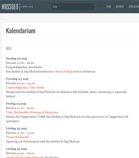 Jag har flera gånger önskat att förlagen och bokhandlarna hade ett enkelt kalendarium så att man kan få information om var och när man kan lyssna på sina favoritförfattare, eller få en bok signerad.