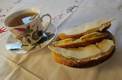 Nygräddat hälla-ut-bröd med vällagrad grevéost och en stor kopp earl grey.